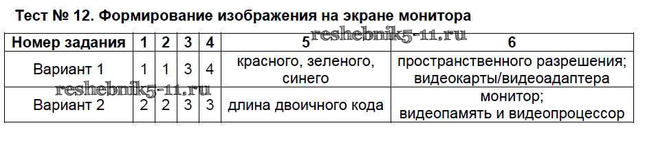 Готовая домашняя работа с ответами по Информатике за 7 класс Масленикова Контрольно-измерительные материалы (КИМ) ВАКО 2017 ФГОС - Тесты Тест №12. Формирование изображения на экране монитора