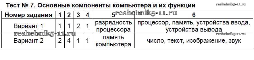 Решебник / тест / тест №7. Основные компоненты компьютера и их функции