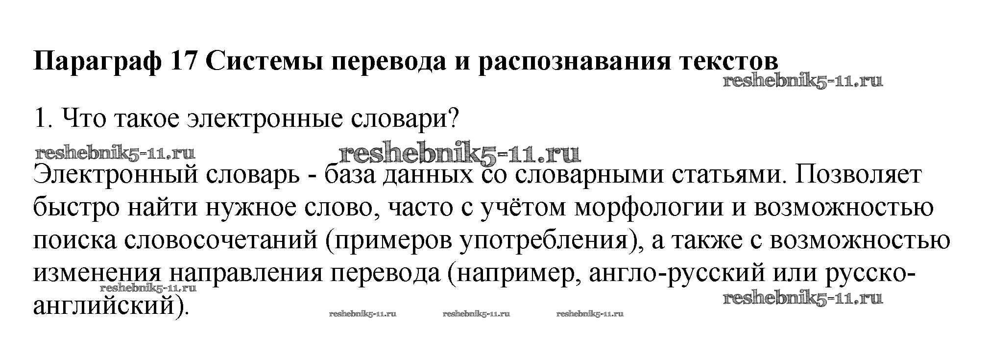Готовая домашняя работа с ответами по Информатике за 7 класс Семакин, Залогова, Русаков, Шестакова Учебник Бином 2017 ФГОС - § 17. Системы перевода и распознавания текстов 1