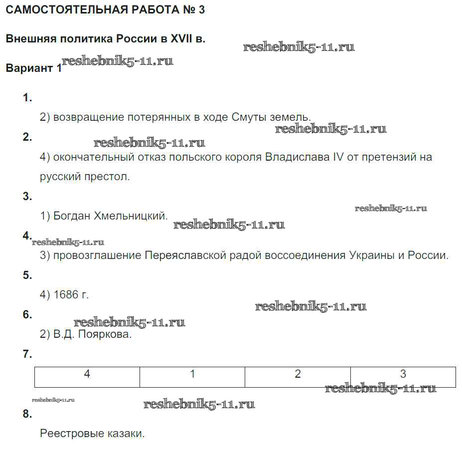 Готовая домашняя работа с ответами по Истории за 7 класс Акиньшина, Артасов Рабочая тетрадь Национальное образование 2013 ФГОС - СР-3. Внешняя политика России в XVII веке Вариант 1