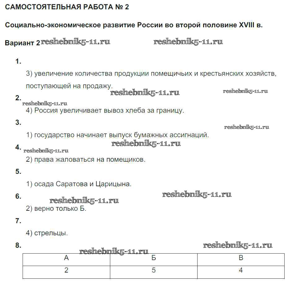 Готовая домашняя работа с ответами по Истории за 7 класс Акиньшина, Артасов Рабочая тетрадь Национальное образование 2013 ФГОС - СР-2. Социально-экономическое развитие России во второй половине XVIII века Вариант 2