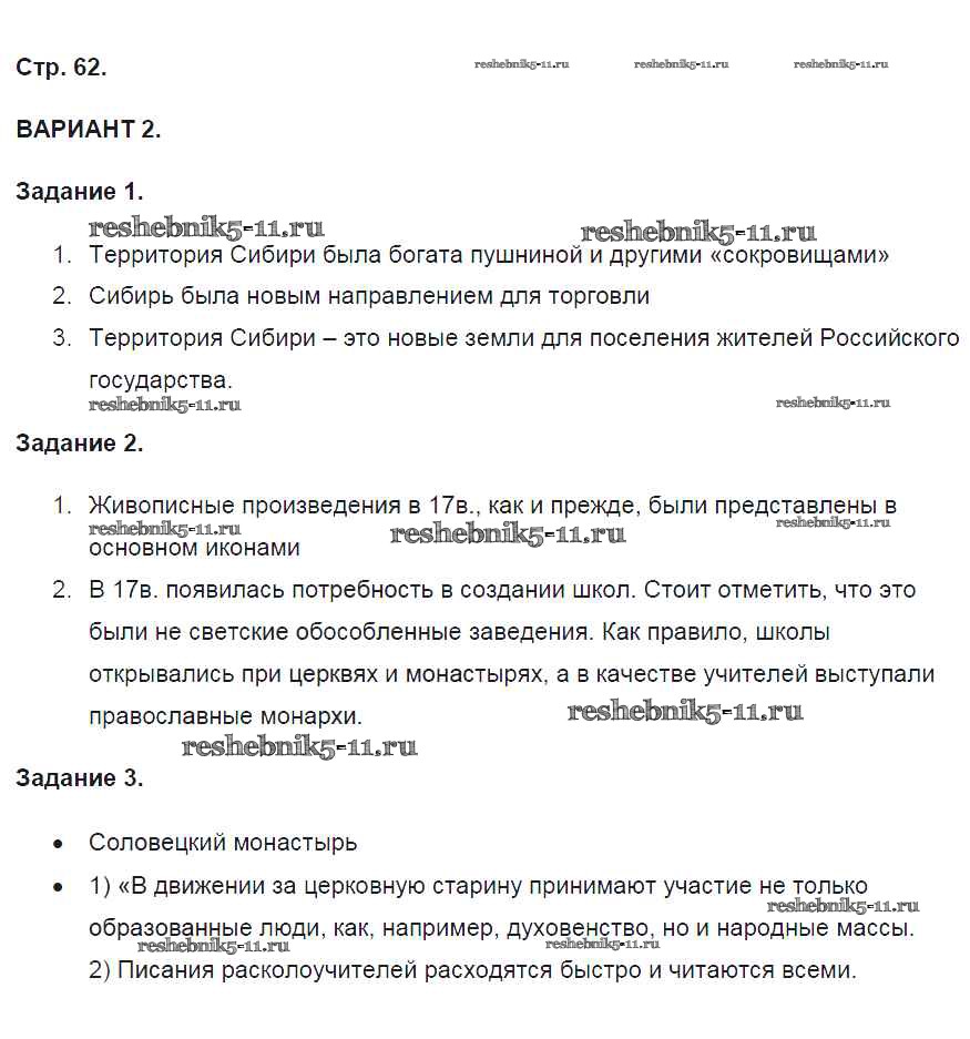 Готовая домашняя работа с ответами по Истории за 7 класс Артасов Контрольные работы УМК Просвещение 2016 ФГОС - Страницы 62
