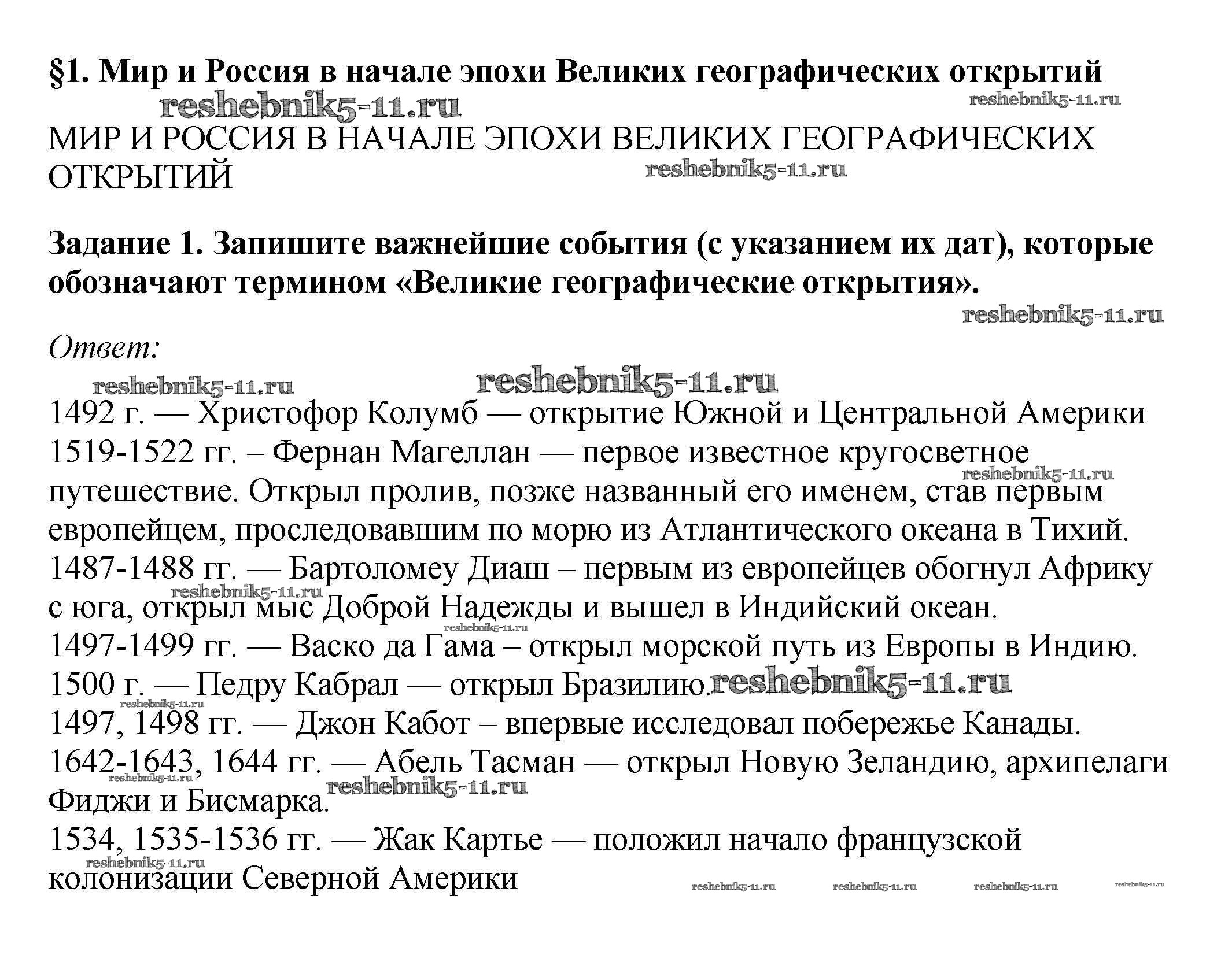 Готовая домашняя работа с ответами по Истории за 7 класс Данилов, Косулина, Лукутин, Соколова Рабочая тетрадь УМК Просвещение 2016 ФГОС - § 1. Мир и Россия в начале эпохи Великих географических открытий 1