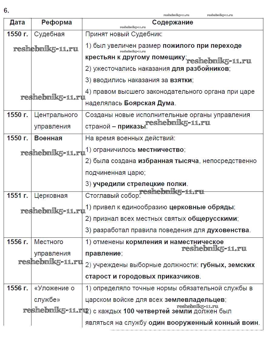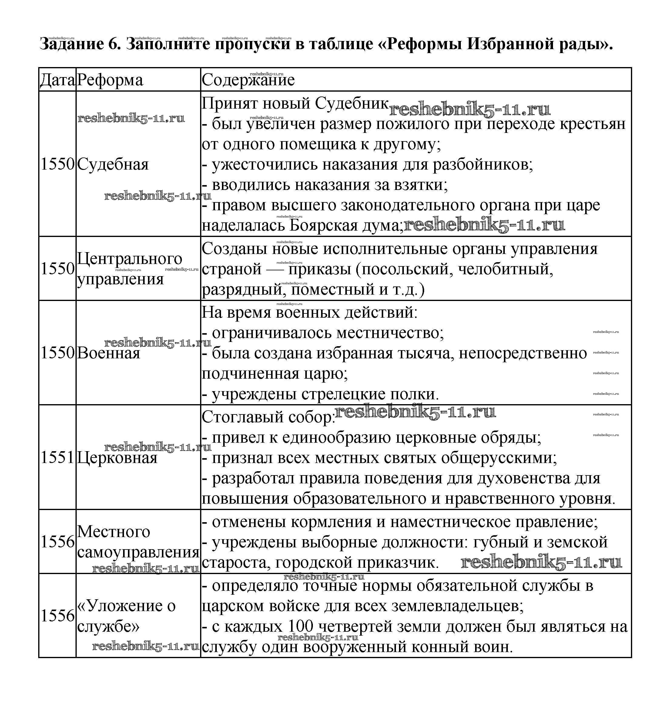 Готовая домашняя работа с ответами по Истории за 7 класс Данилов, Косулина, Лукутин, Соколова Рабочая тетрадь УМК Просвещение 2016 ФГОС - § 6. Начало правление Ивана IV. Реформы Избранной рады 6