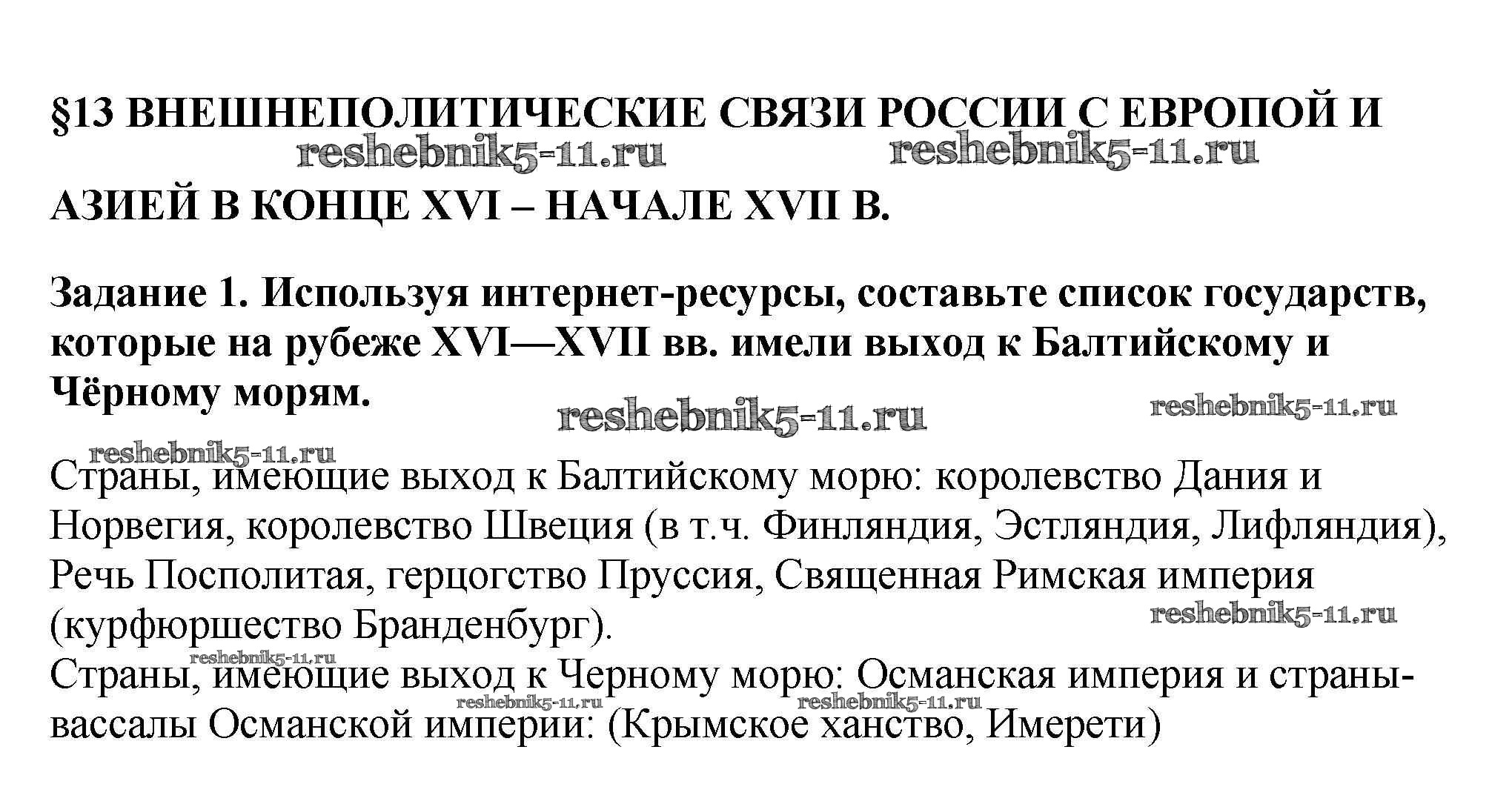 Готовая домашняя работа с ответами по Истории за 7 класс Данилов, Косулина, Лукутин, Соколова Рабочая тетрадь УМК Просвещение 2016 ФГОС - § 13. Внешнеполитические связи России с Европой и Азией в конце XVI — начале XVII в. 1