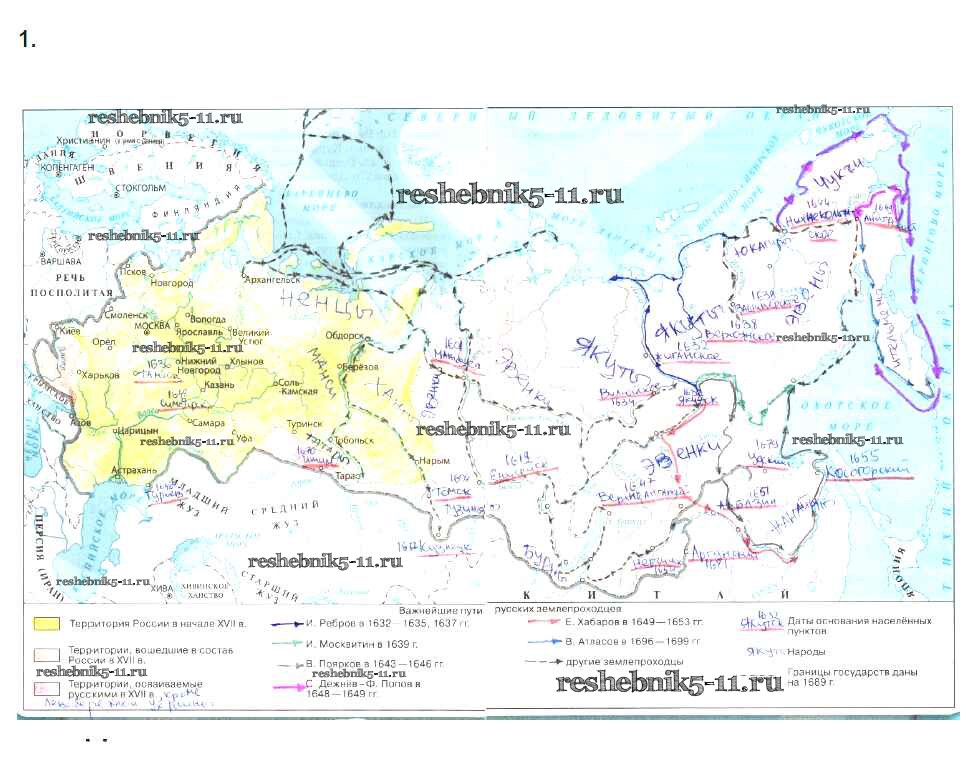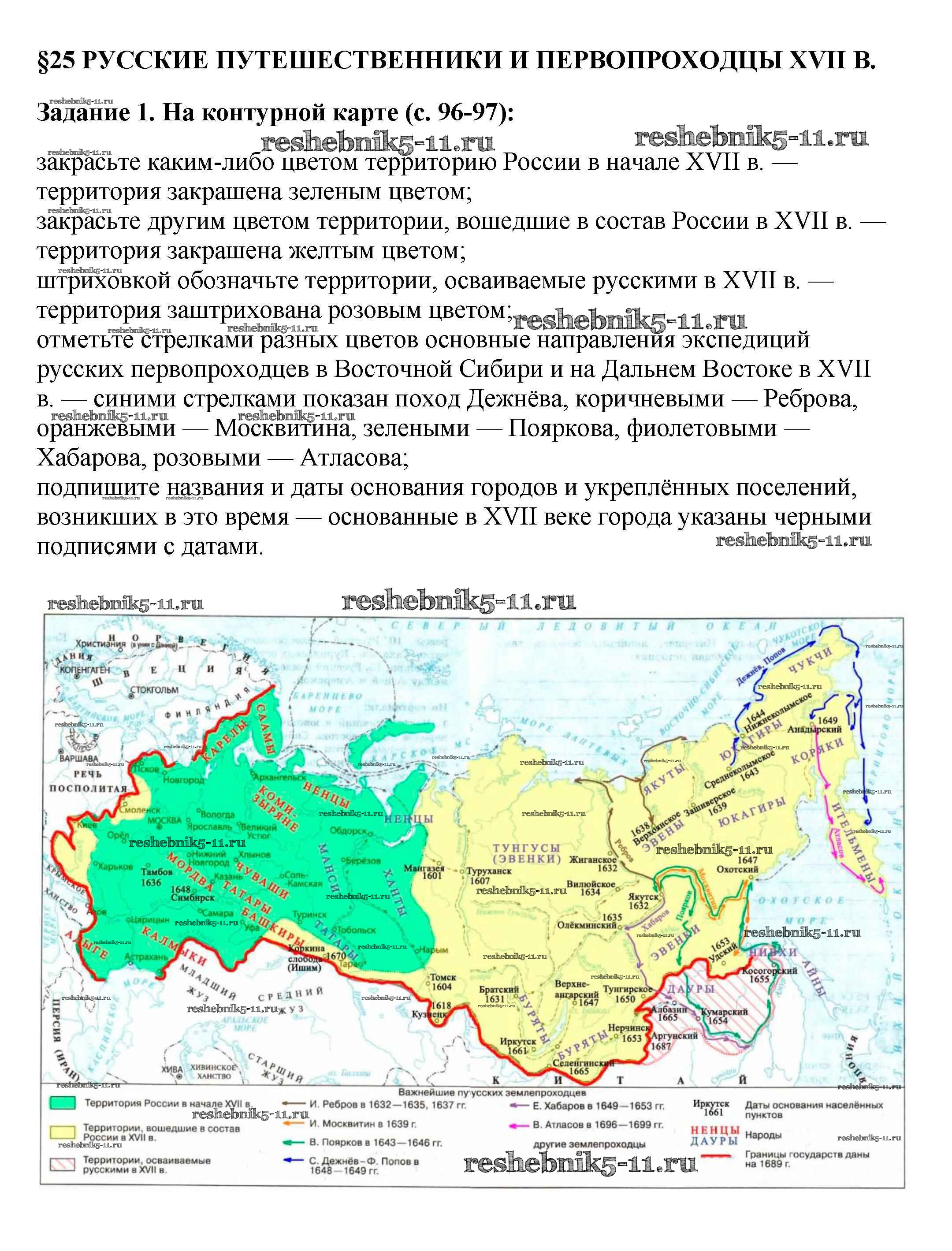 Готовая домашняя работа с ответами по Истории за 7 класс Данилов, Косулина, Лукутин, Соколова Рабочая тетрадь УМК Просвещение 2016 ФГОС - § 25. Русские путешественники и первопроходцы XVII в. 1