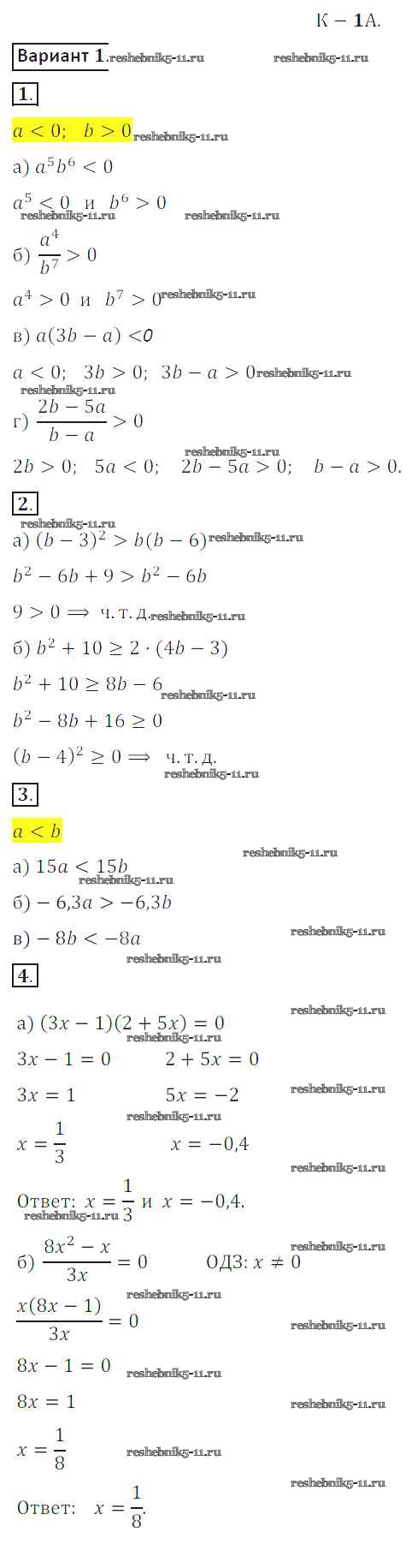 Готовая домашняя работа с ответами по Алгебре за 8 класс Жохов, Макарычев, Миндюк Дидактические материалы Просвещение 2014 ФГОС - КР №1A вариант 1