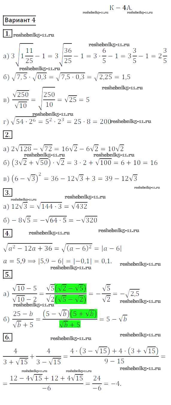 Готовая домашняя работа с ответами по Алгебре за 8 класс Жохов, Макарычев, Миндюк Дидактические материалы Просвещение 2014 ФГОС - КР №4A вариант 4