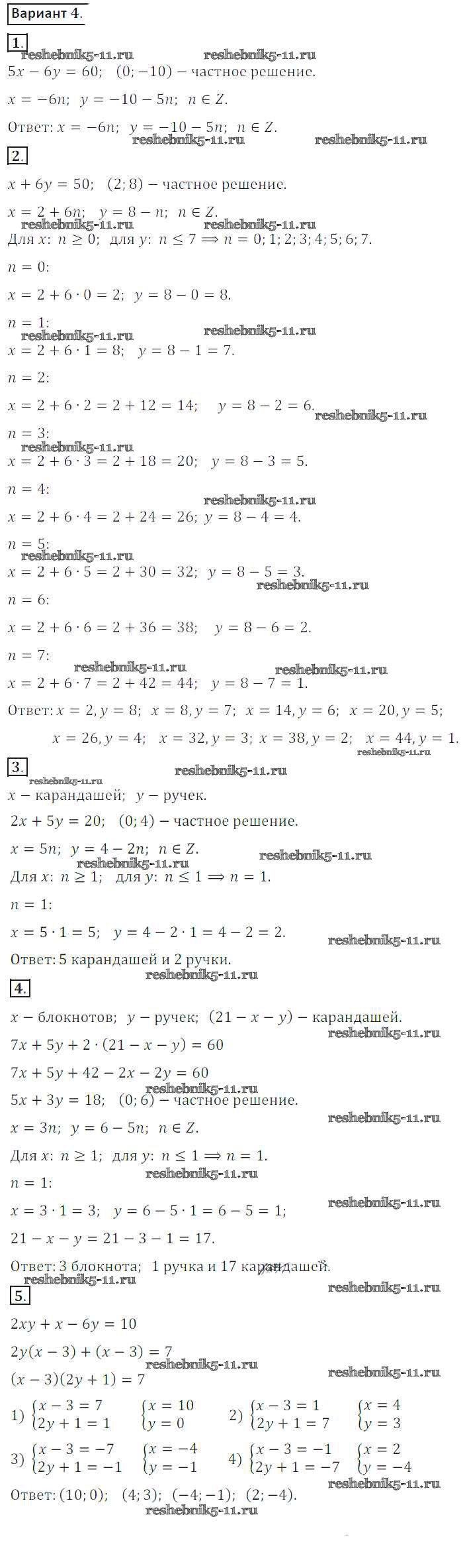 Готовая домашняя работа с ответами по Алгебре за 8 класс Потапов, Шевкин Дидактические материалы МГУ - школе Просвещение 2017 ФГОС - СР №26. Решение уравнений в целых числах вариант 4