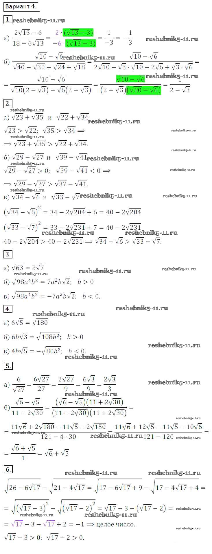 Готовая домашняя работа с ответами по Алгебре за 8 класс Потапов, Шевкин Дидактические материалы МГУ - школе Просвещение 2017 ФГОС - СР №4. Преобразование выражений, содержащих квадратные корни вариант 4