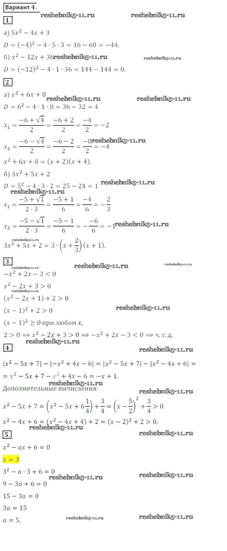 Готовая домашняя работа с ответами по Алгебре за 8 класс Потапов, Шевкин Дидактические материалы МГУ - школе Просвещение 2017 ФГОС - СР №5. Квадратный трехчлен вариант 4