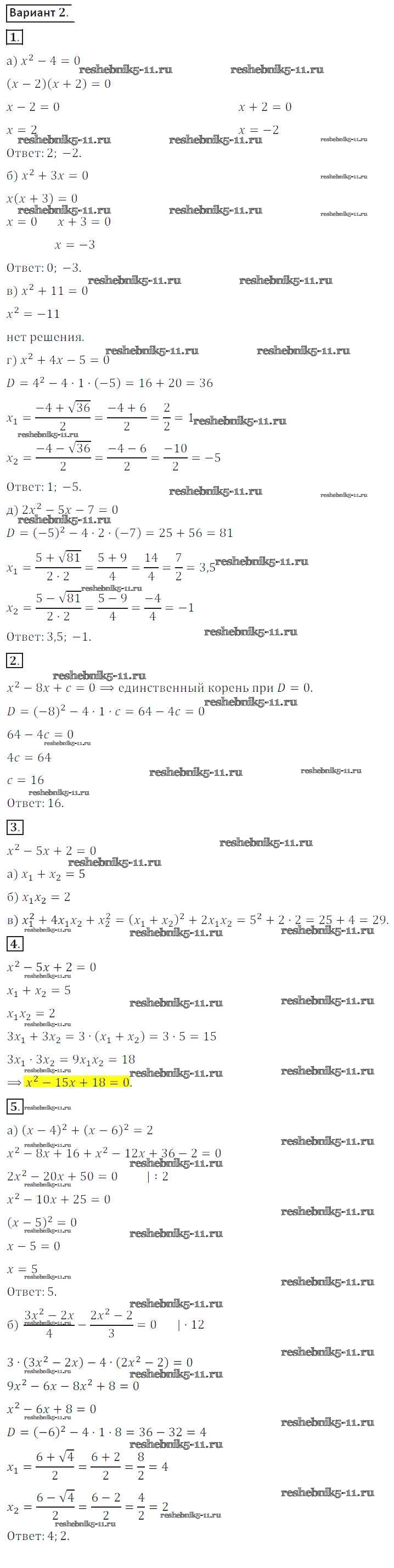 Готовая домашняя работа с ответами по Алгебре за 8 класс Потапов, Шевкин Дидактические материалы МГУ - школе Просвещение 2017 ФГОС - СР №6. Квадратные уравнения вариант 2
