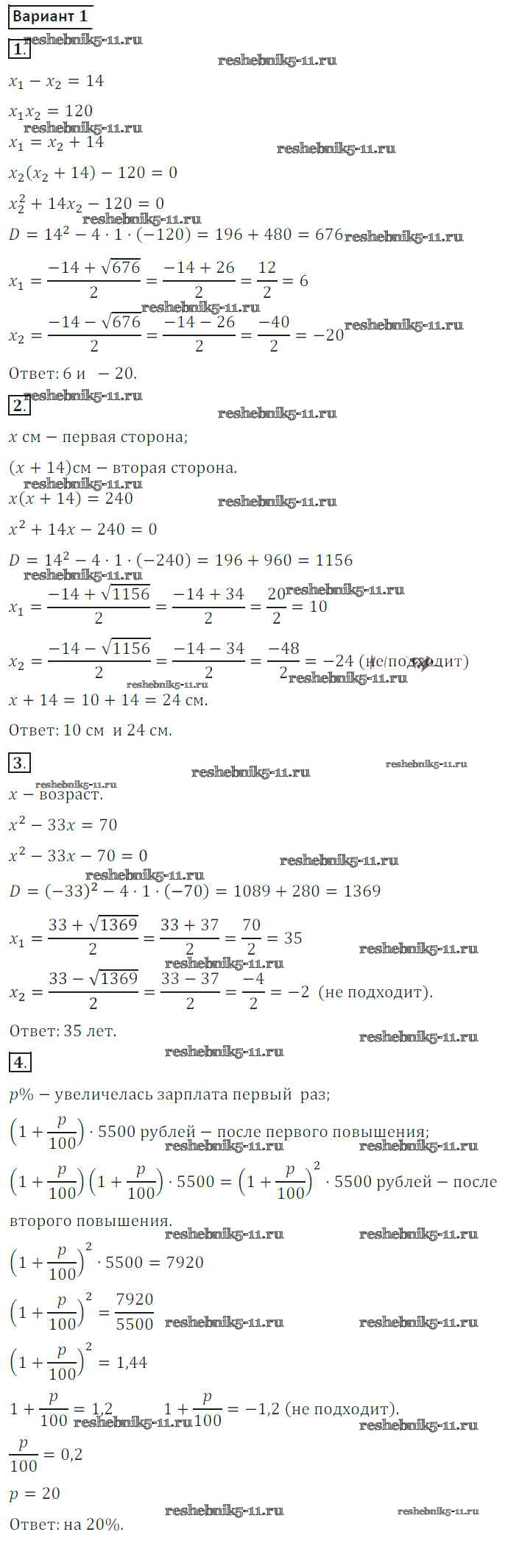 Готовая домашняя работа с ответами по Алгебре за 8 класс Потапов, Шевкин Дидактические материалы МГУ - школе Просвещение 2017 ФГОС - СР №7. Решение задач при помощи квадратных уравнений вариант 1