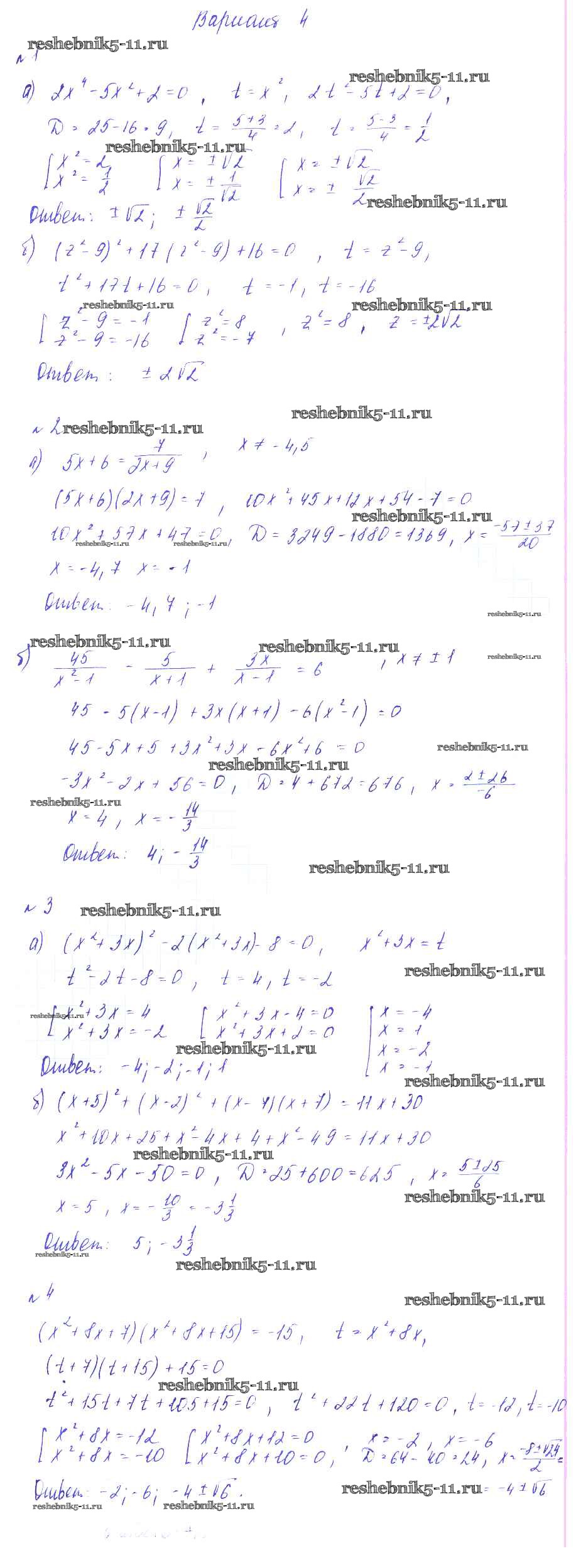 Готовая домашняя работа с ответами по Алгебре за 8 класс Зив, Гольдич Дидактические материалы Виктория плюс 2012 ФГОС - СР №12. Уравнения, сводящиеся к квадратным Вариант-4