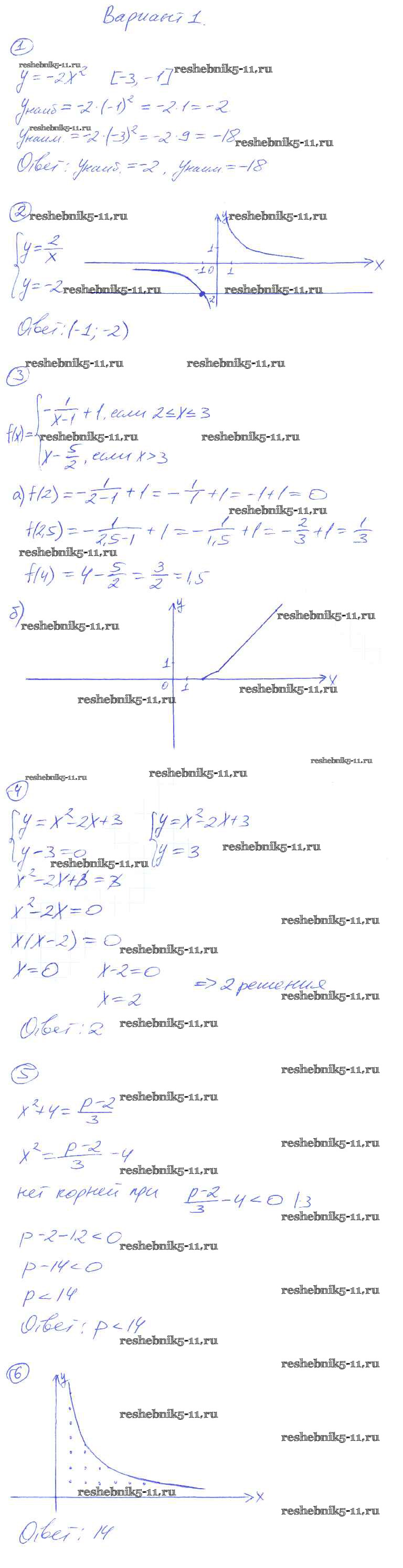 Готовая домашняя работа с ответами по Алгебре за 8 класс Попов Дидактические материалы УМК Экзамен 2014 ФГОС - КР-3. Квадратичная функция. Функция y = k:x вариант-1