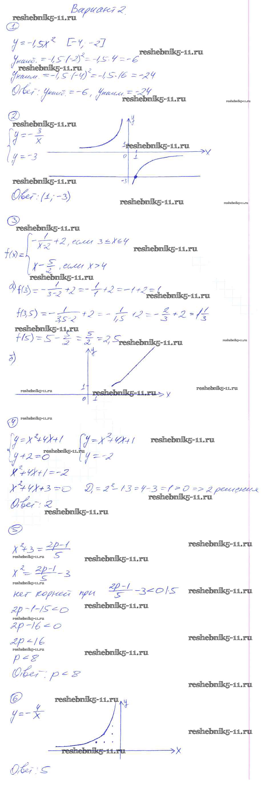 Готовая домашняя работа с ответами по Алгебре за 8 класс Попов Дидактические материалы УМК Экзамен 2014 ФГОС - КР-3. Квадратичная функция. Функция y = k:x вариант-2