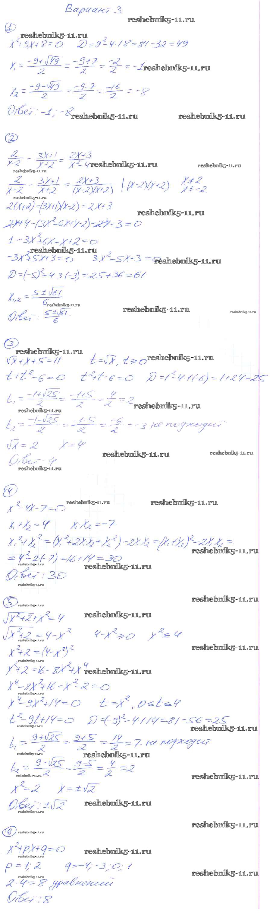 Готовая домашняя работа с ответами по Алгебре за 8 класс Попов Дидактические материалы УМК Экзамен 2014 ФГОС - КР-4. Квадратные уравнения вариант-3