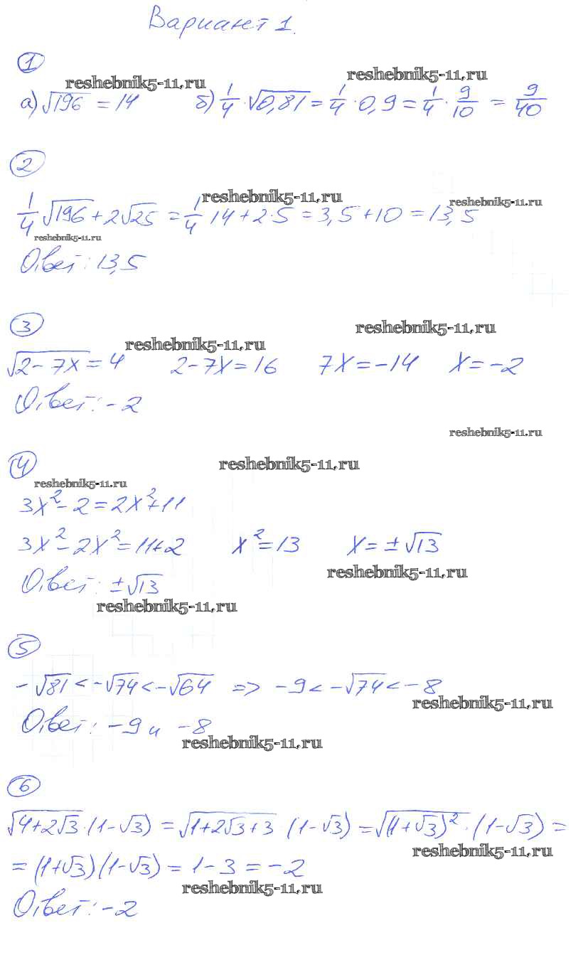 Готовая домашняя работа с ответами по Алгебре за 8 класс Попов Дидактические материалы УМК Экзамен 2014 ФГОС - СР-10. Понятие квадратного корня из неотрицательного числа вариант-1