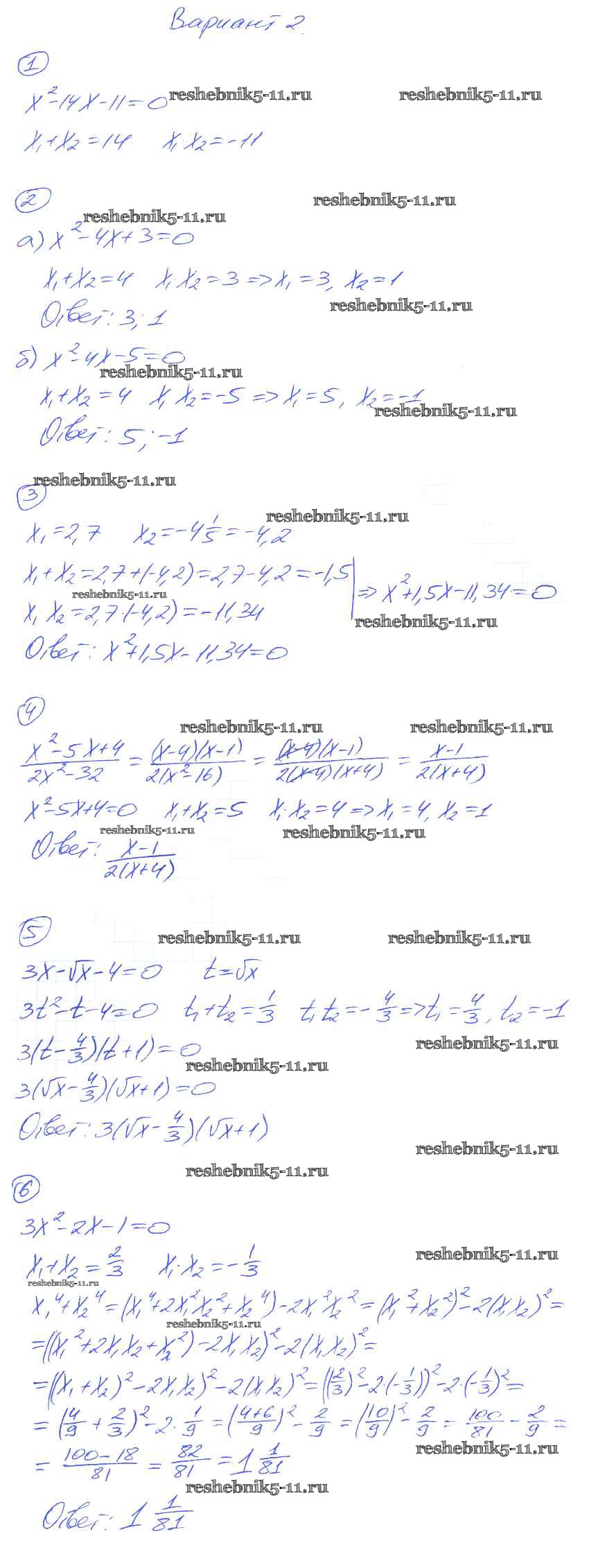 Готовая домашняя работа с ответами по Алгебре за 8 класс Попов Дидактические материалы УМК Экзамен 2014 ФГОС - СР-29. Теорема Виета вариант-2