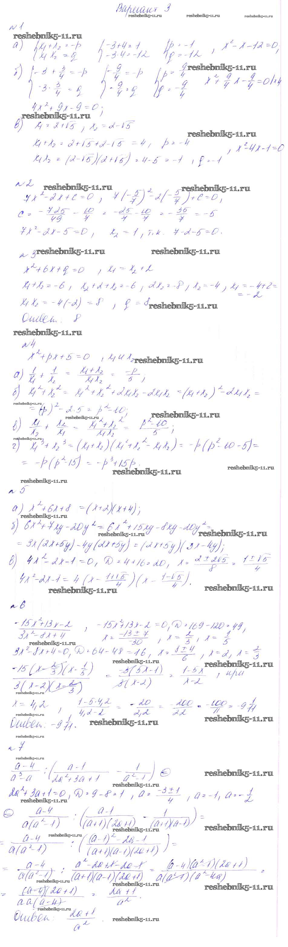Готовая домашняя работа с ответами по Алгебре за 8 класс Феоктистов Дидактические материалы Мнемозина 2013 ФГОС - СР-15. Свойство корней квадратного уравнения, симметрические многочлены, разложение квадратного трехчлена на множ вариант 3