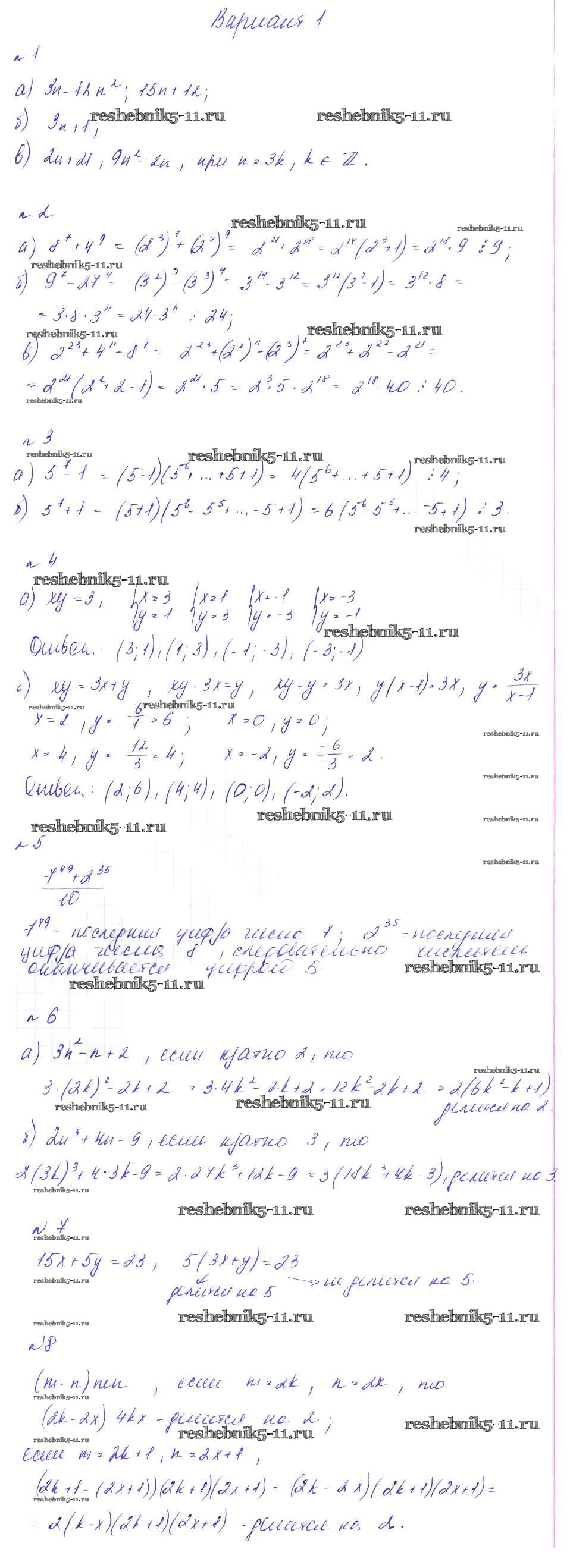 Готовая домашняя работа с ответами по Алгебре за 8 класс Феоктистов Дидактические материалы Мнемозина 2013 ФГОС - СР-7. Свойства делимости, делимость суммы и произведения вариант 1