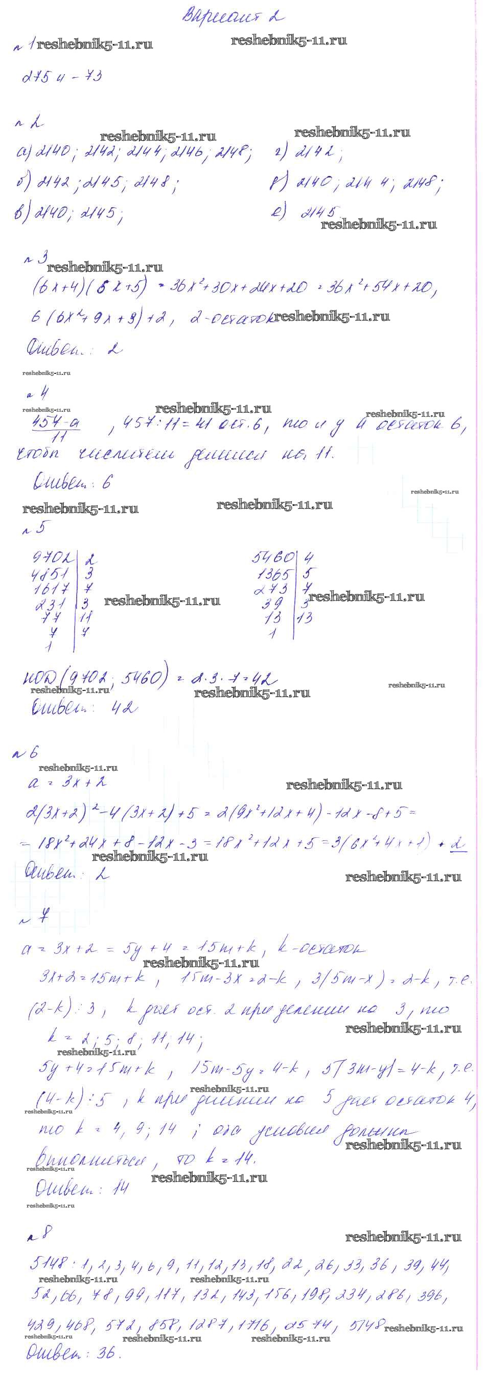 Готовая домашняя работа с ответами по Алгебре за 8 класс Феоктистов Дидактические материалы Мнемозина 2013 ФГОС - СР-8. Деление с остатком, признаки делимости, простые и составные числа вариант 2