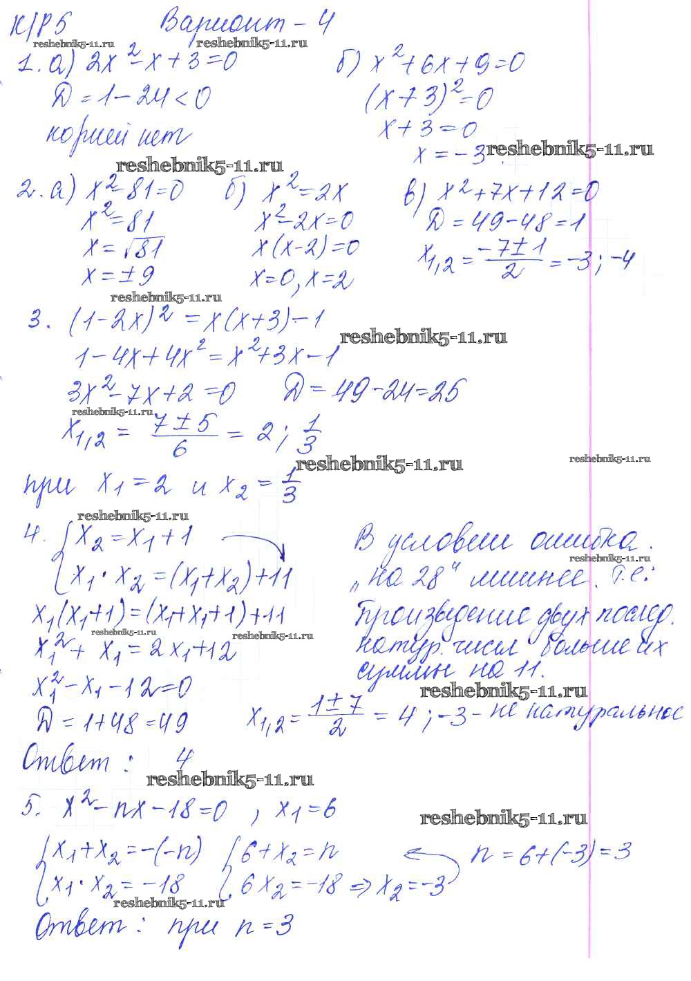 Готовая домашняя работа с ответами по Алгебре за 8 класс Дудницын, Кронгауз Контрольные работы УМК Экзамен 2010 ФГОС - КР-5. Квадратные уравнения. Варианты 4