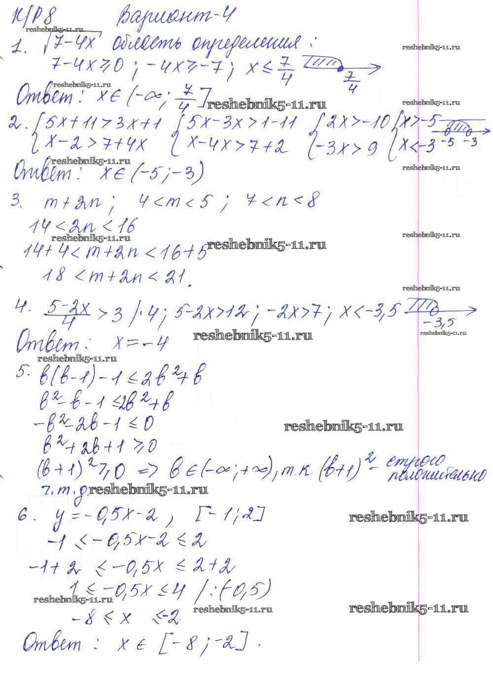 Готовая домашняя работа с ответами по Алгебре за 8 класс Дудницын, Кронгауз Контрольные работы УМК Экзамен 2010 ФГОС - КР-8. Системы неравенств с одной переменной. Варианты 4