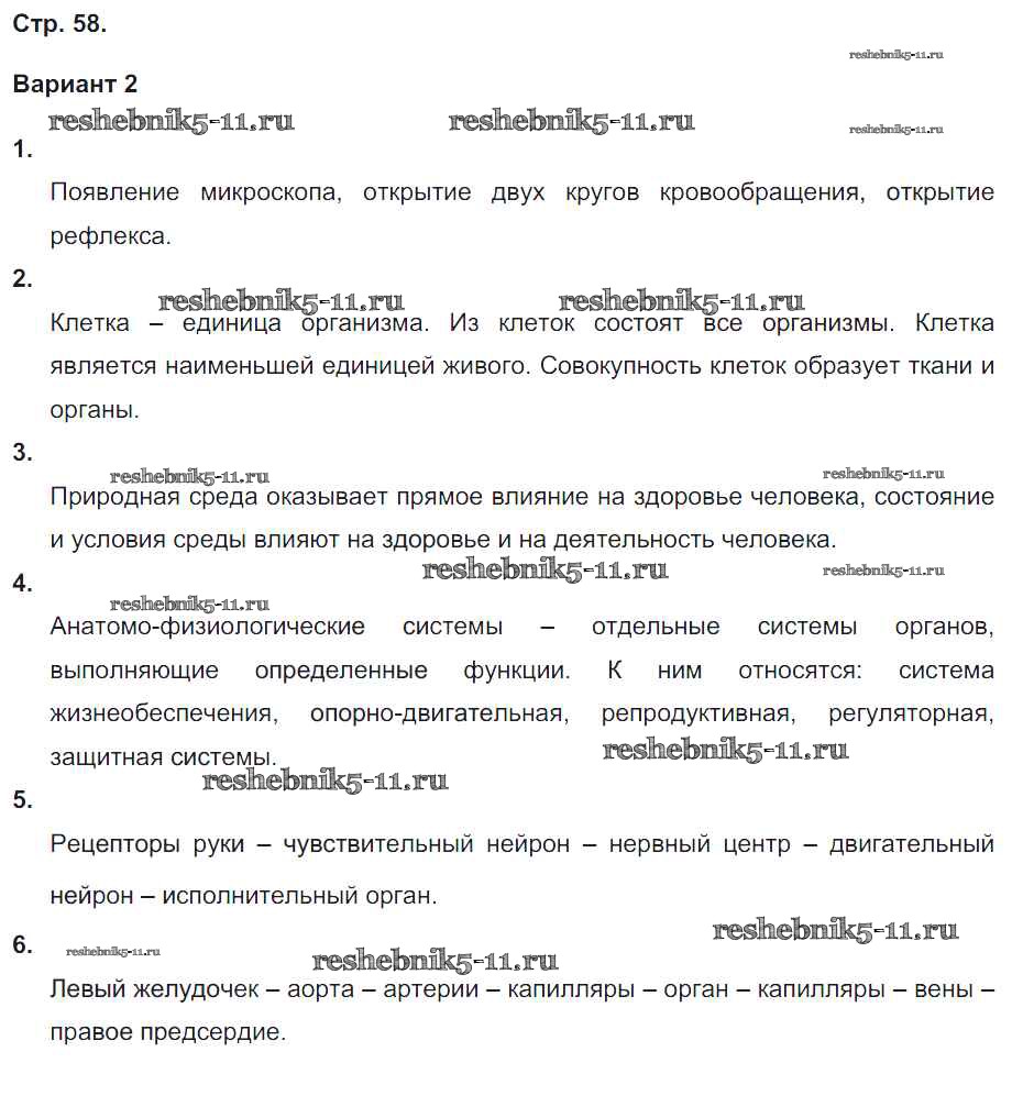 Готовая домашняя работа с ответами по Биологии за 8 класс Сухорукова, Кучменко, Ефремова Тетрадь-экзаменатор Сферы Просвещение 2016 ФГОС - Страницы 58
