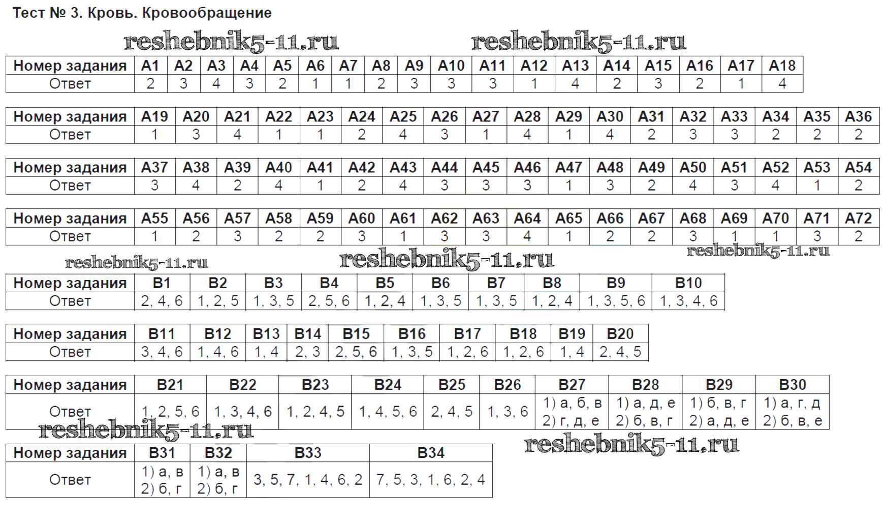 Готовая домашняя работа с ответами по Биологии за 8 класс Солодова Тестовые задания Вентана-граф 2019 ФГОС - Тесты 3