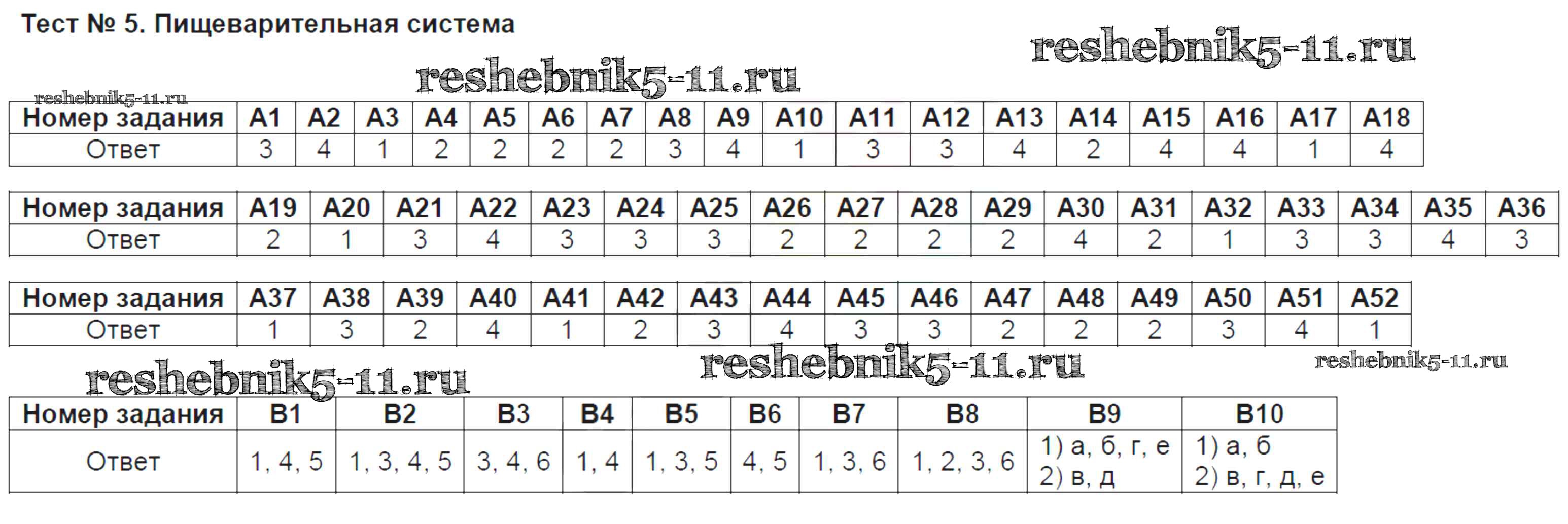 Готовая домашняя работа с ответами по Биологии за 8 класс Солодова Тестовые задания Вентана-граф 2019 ФГОС - Тесты 5