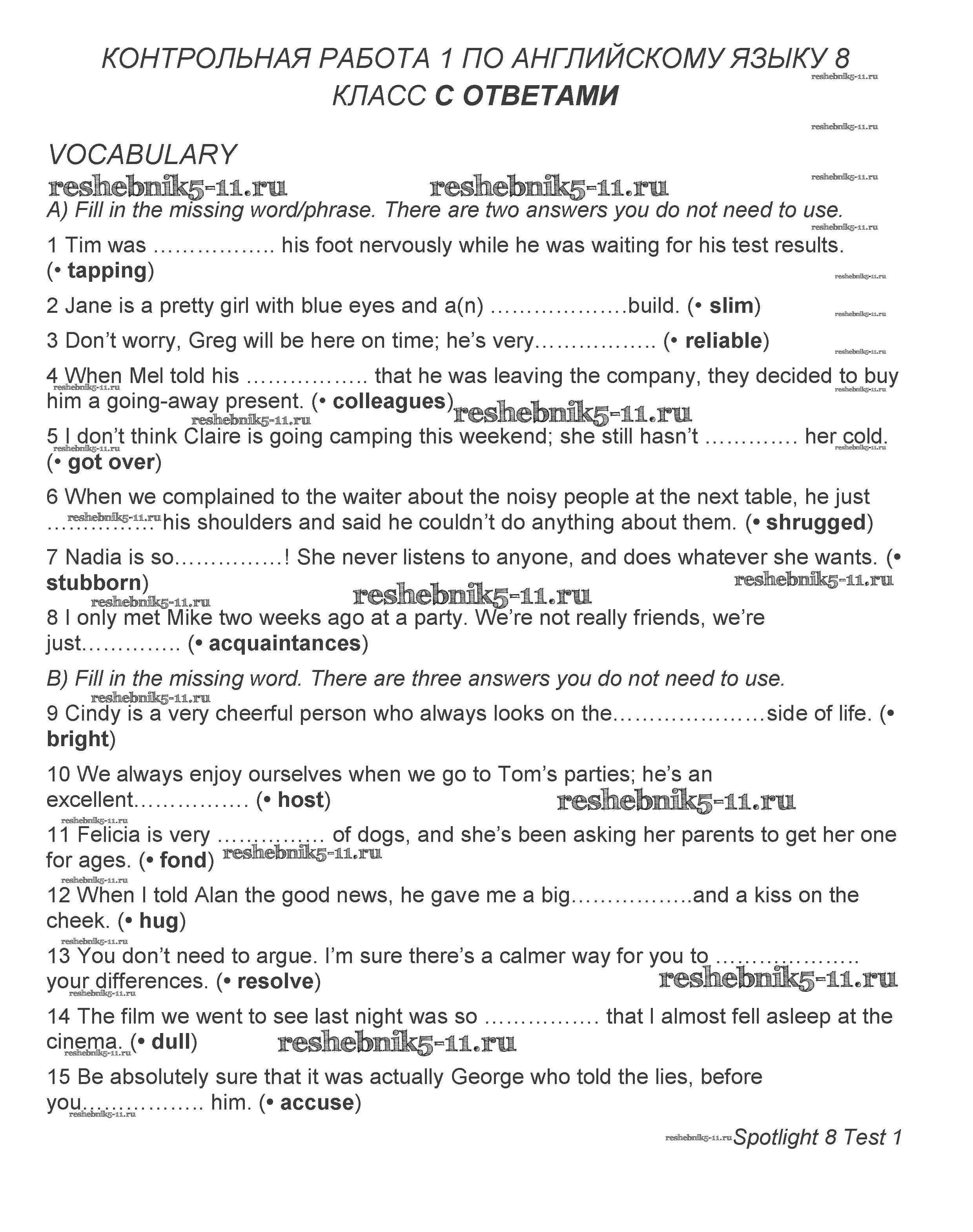 Готовая домашняя работа с ответами по Английскому языку за 8 класс Ваулина, Дули, Подоляко, Эванс Контрольные задания Spotlight Просвещение 2018 ФГОС - Контрольная работа 1 A, B