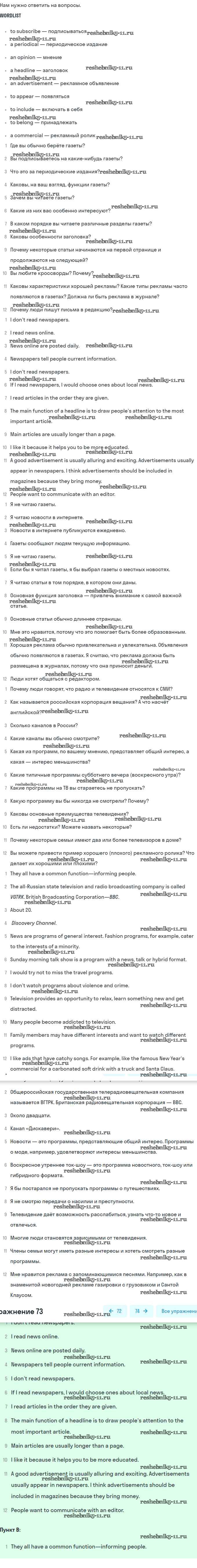 Готовая домашняя работа с ответами по Английскому языку за 8 класс Афанасьева, Михеева Учебник Углубленный уровень Просвещение 2014 ФГОС - Unit 6. Newspapers and Television: The World of Mass Media 73