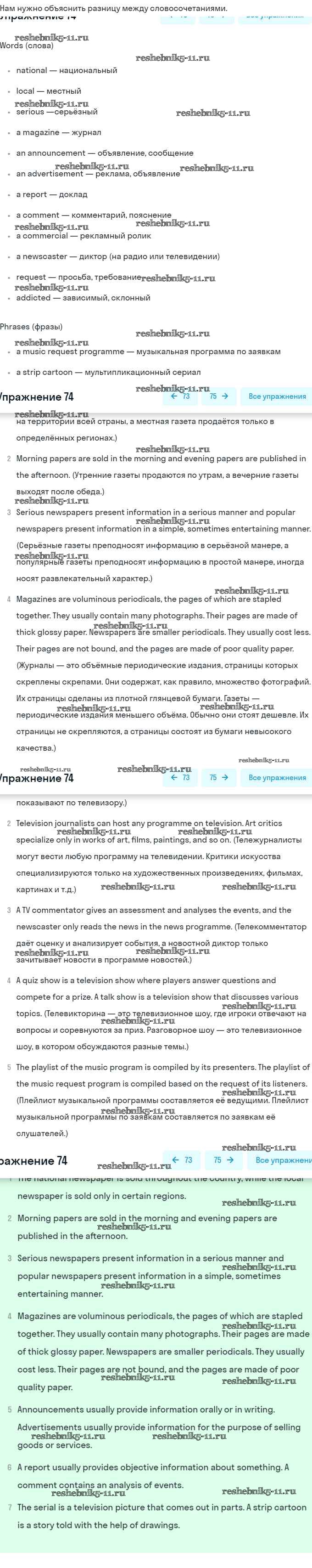 Готовая домашняя работа с ответами по Английскому языку за 8 класс Афанасьева, Михеева Учебник Углубленный уровень Просвещение 2014 ФГОС - Unit 6. Newspapers and Television: The World of Mass Media 74