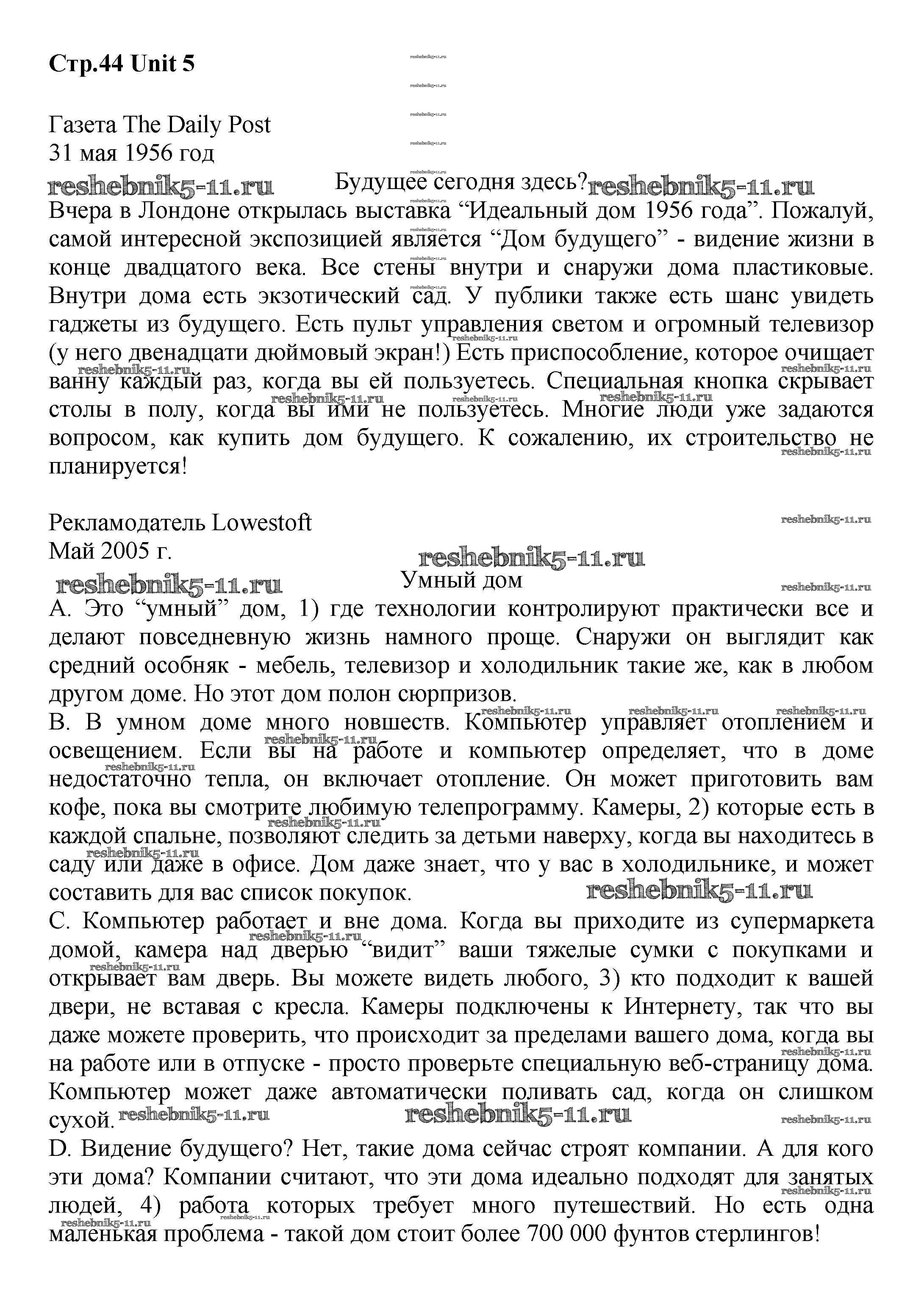 Готовая домашняя работа с ответами по Английскому языку за 8 класс Вербицкая, Маккинли, Хастингс, Миндрул Учебник Forward Вентана-граф 2016 ФГОС - Unit 5 No place like home стр.44