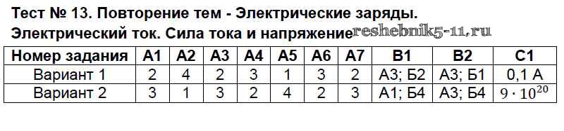 Готовая домашняя работа с ответами по Физике за 8 класс Бобошина Контрольно-измерительные материалы (КИМ) Экзамен 2014 ФГОС - Тесты Тест-13. Повторение тем - Электрические заряды. Электрический ток. Сила тока и напряжение