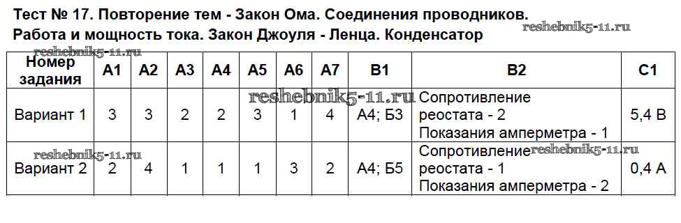 Готовая домашняя работа с ответами по Физике за 8 класс Бобошина Контрольно-измерительные материалы (КИМ) Экзамен 2014 ФГОС - Тесты Тест-17. Повторение тем - Закон Ома. Соединения проводников и др.