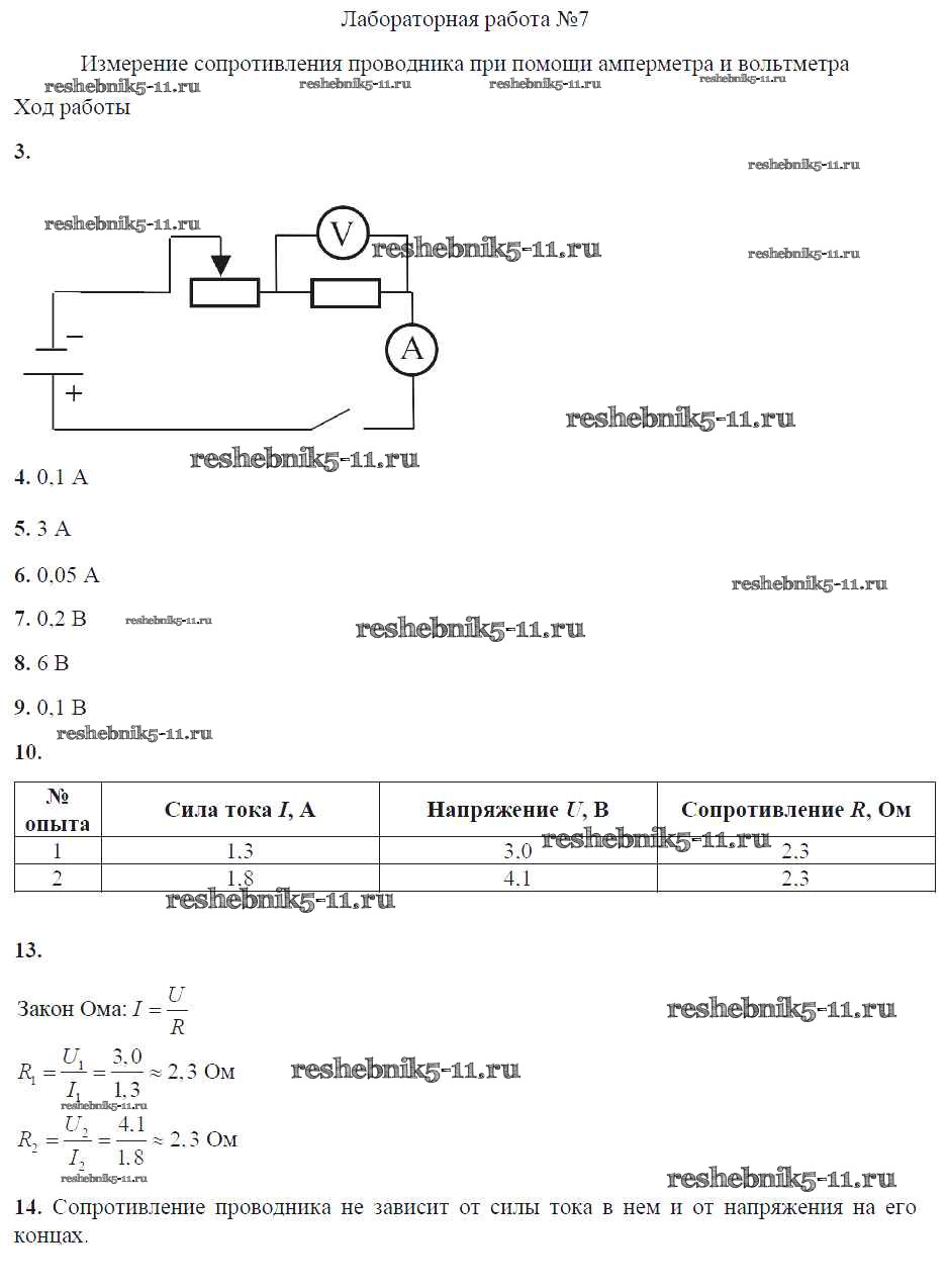 Готовая домашняя работа с ответами по Физике за 8 класс Минькова, Иванова Тетрадь для лабораторных работ УМК Экзамен 2014 ФГОС - Лабораторные работы ЛР №7. Измерение сопротивления проводника при помощи амперметра и вольтметра