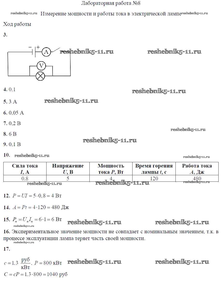 Готовая домашняя работа с ответами по Физике за 8 класс Минькова, Иванова Тетрадь для лабораторных работ УМК Экзамен 2014 ФГОС - Лабораторные работы ЛР №8. Измерение мощности и работы тока в электрической лампе