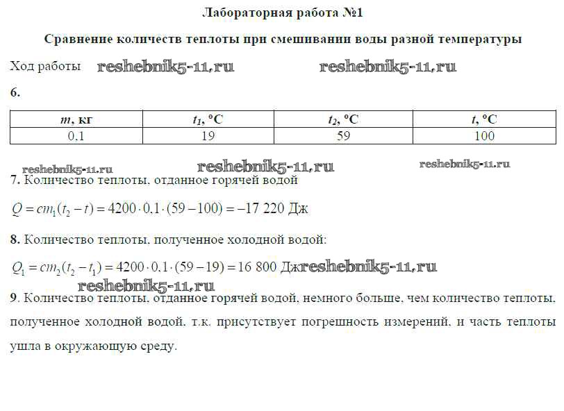 Готовая домашняя работа с ответами по Физике за 8 класс Громов, Родина, Белага Учебник Просвещение 2018 ФГОС - Лабораторные работы ЛР №1. Сравнение количеств теплоты при смешивании воды разной температуры