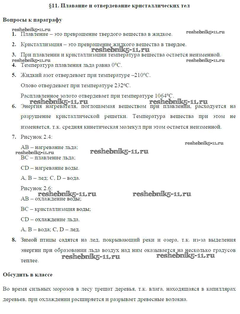 Готовая домашняя работа с ответами по Физике за 8 класс Громов, Родина, Белага Учебник Просвещение 2018 ФГОС - Параграфы § 11. Плавание и отвердевание кристаллических тел
