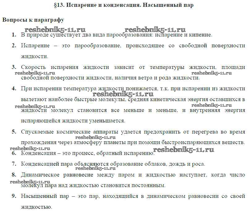 Готовая домашняя работа с ответами по Физике за 8 класс Громов, Родина, Белага Учебник Просвещение 2018 ФГОС - Параграфы § 13. Испарение и конденсация. Насыщенный пар