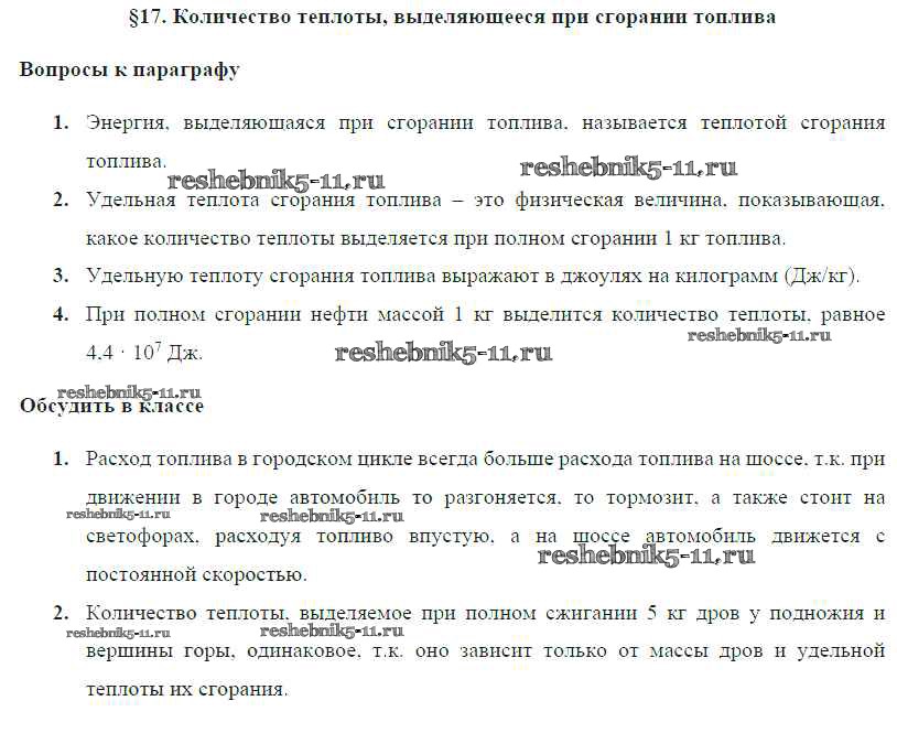 Готовая домашняя работа с ответами по Физике за 8 класс Громов, Родина, Белага Учебник Просвещение 2018 ФГОС - Параграфы § 17. Количество теплоты, выделяющееся при сгорании топлива