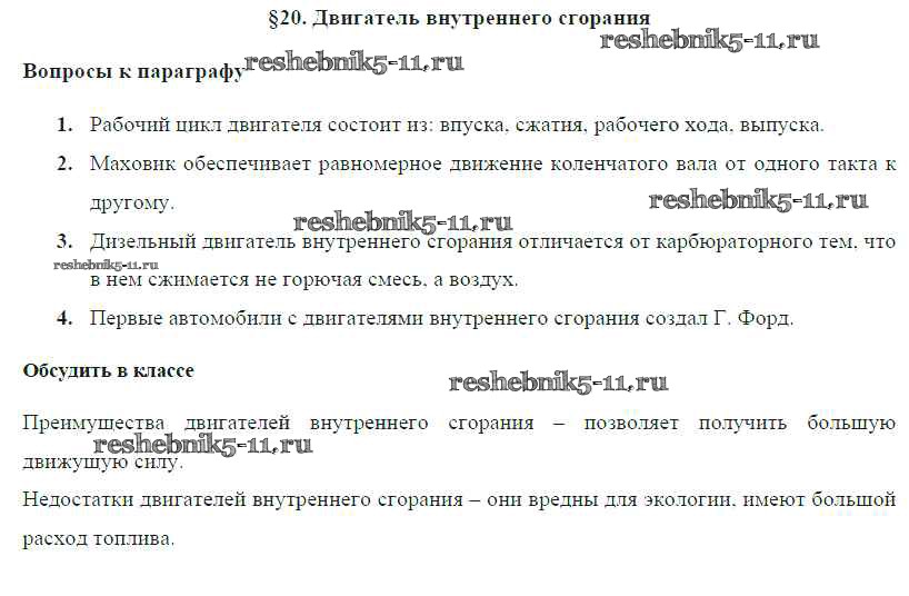 Готовая домашняя работа с ответами по Физике за 8 класс Громов, Родина, Белага Учебник Просвещение 2018 ФГОС - Параграфы § 20. Двигатель внутреннего сгорания