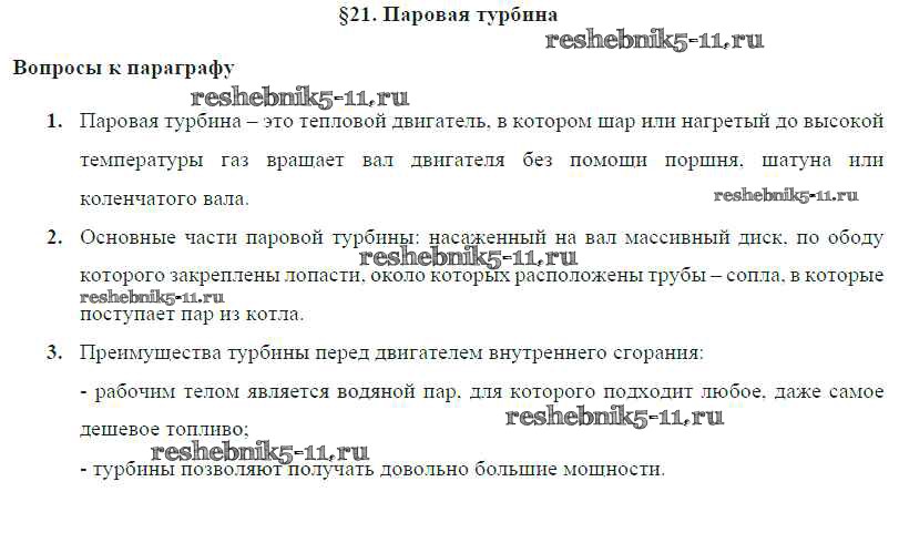 Готовая домашняя работа с ответами по Физике за 8 класс Громов, Родина, Белага Учебник Просвещение 2018 ФГОС - Параграфы § 21. Паровая турбина