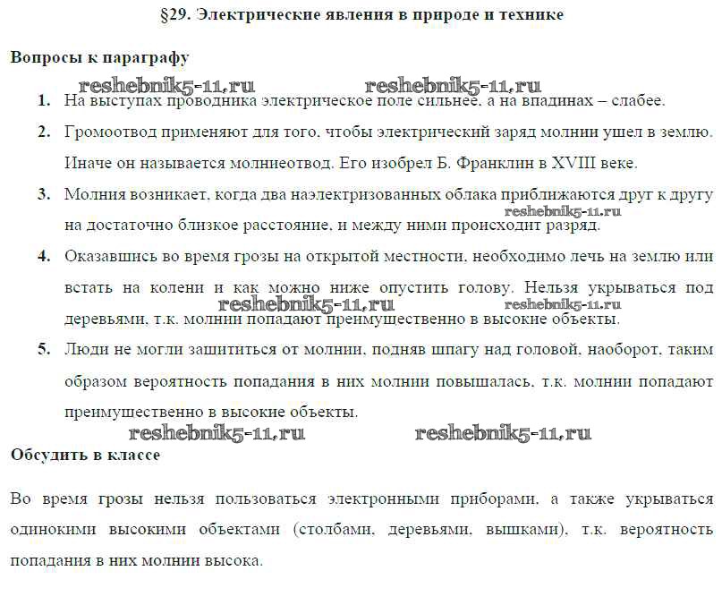 Готовая домашняя работа с ответами по Физике за 8 класс Громов, Родина, Белага Учебник Просвещение 2018 ФГОС - Параграфы § 29. Электрические явления в природе и технике