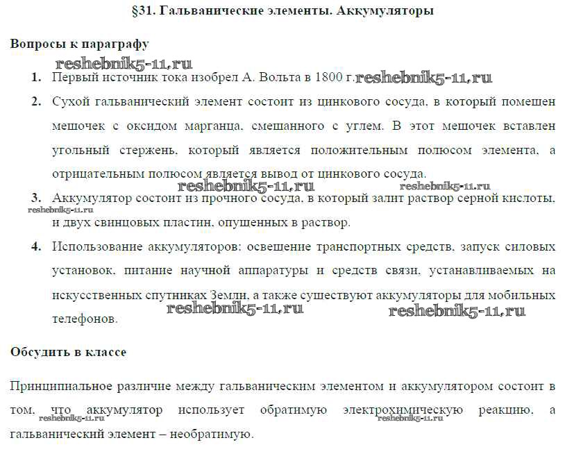 Готовая домашняя работа с ответами по Физике за 8 класс Громов, Родина, Белага Учебник Просвещение 2018 ФГОС - Параграфы § 31. Гальванические элементы. Аккумуляторы