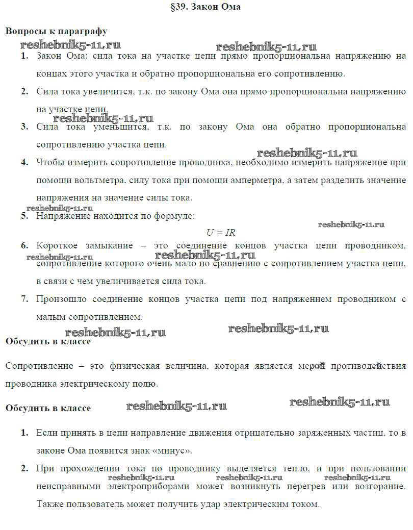 Готовая домашняя работа с ответами по Физике за 8 класс Громов, Родина, Белага Учебник Просвещение 2018 ФГОС - Параграфы § 39. Закон Ома