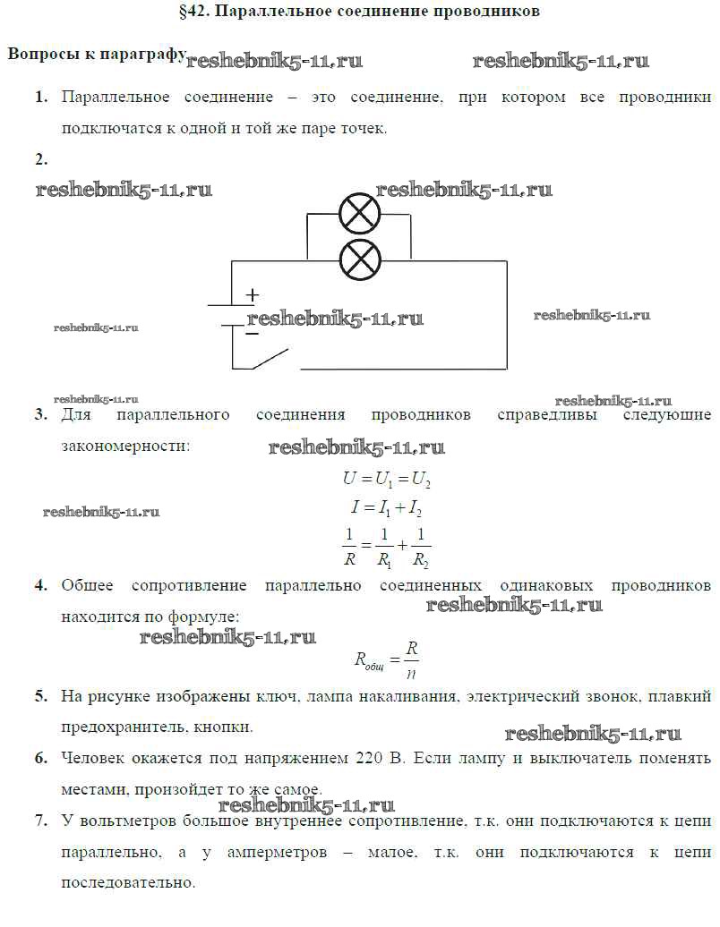 Готовая домашняя работа с ответами по Физике за 8 класс Громов, Родина, Белага Учебник Просвещение 2018 ФГОС - Параграфы § 42. Параллельное соединение проводников