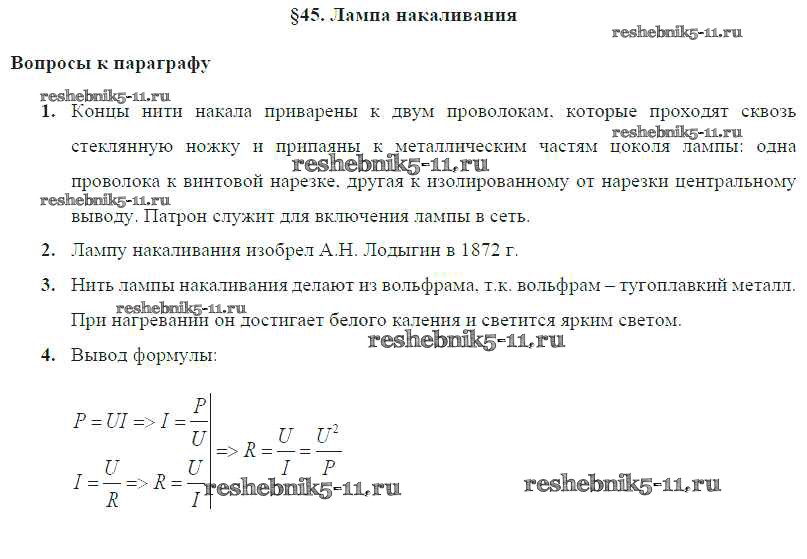 Готовая домашняя работа с ответами по Физике за 8 класс Громов, Родина, Белага Учебник Просвещение 2018 ФГОС - Параграфы § 45. Лампа накаливания